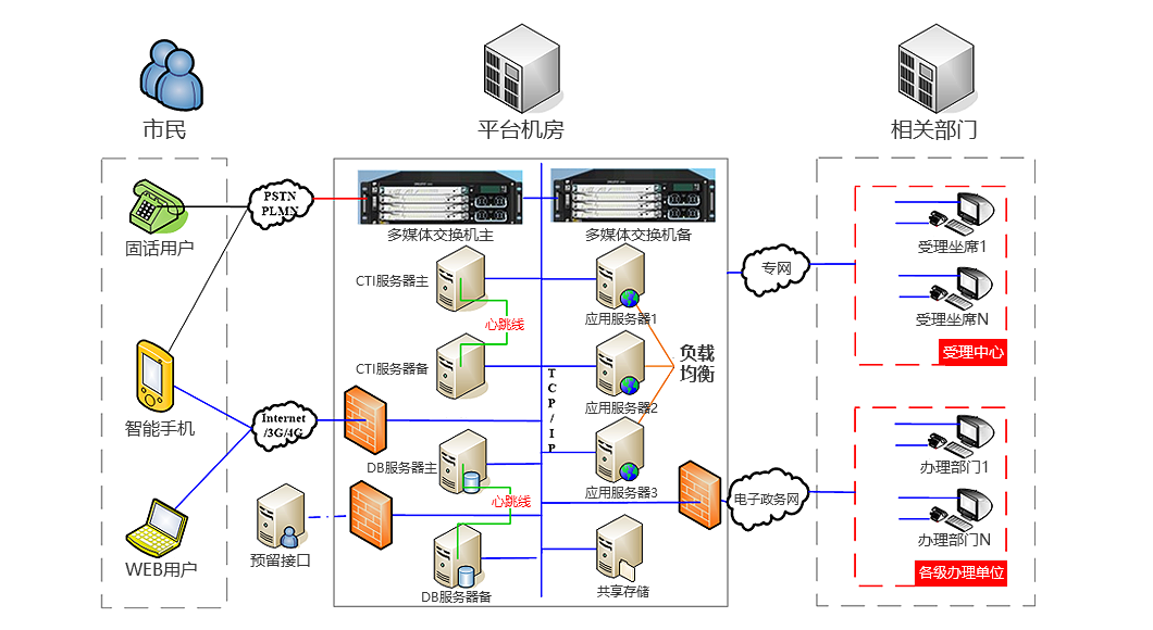 如此,在實現對市民意見、問題求助、建議、投訴、表揚等各類民生信息進行廣泛收集、高效分析、及時處理、及時回復的同時,通過現代科技手段和信息技術提高政府服務熱線對市民的服務的能力。系統組網示意圖